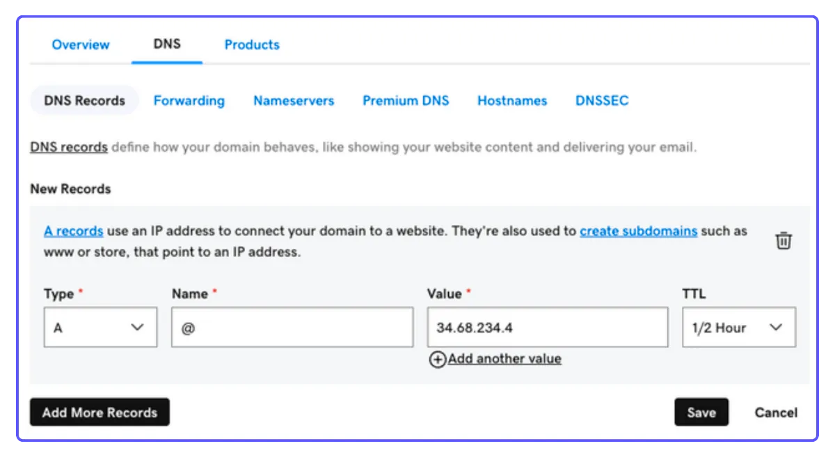For a main domain, put @ in the "Name" field, paste the value you copied into the "Value" field, and set "TTL" to 30 minutes (or ½ hour). Click Save.