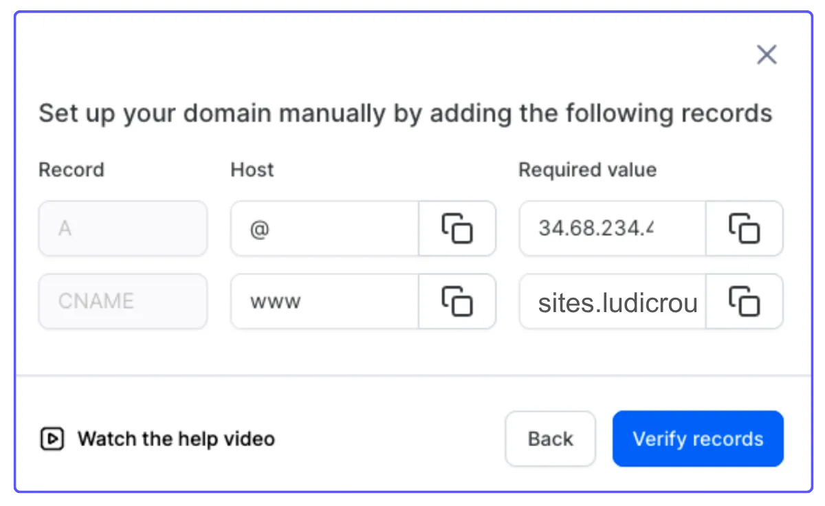 If you're using a subdomain, copy the CNAME record value: site.ludicrous.com.