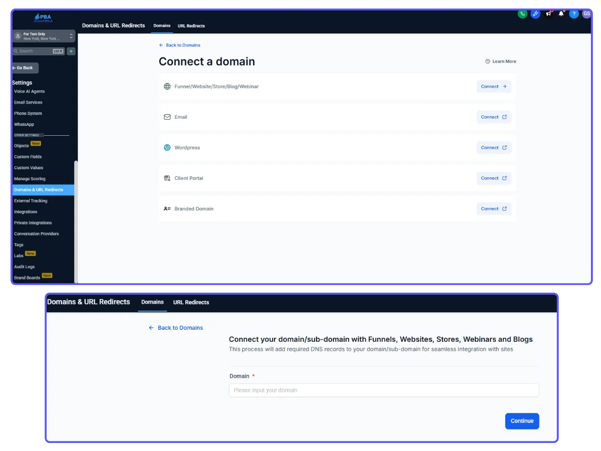 Step 2: Enter your domain name (e.g., yourwebsite.com) or a subdomain (e.g., shop.yourwebsite.com), then click Continue.