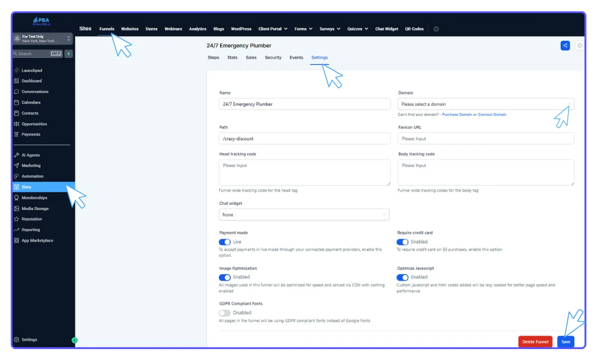 Once verified, you can connect it to your funnel. Go to Sites, then Funnels, and pick your funnel.