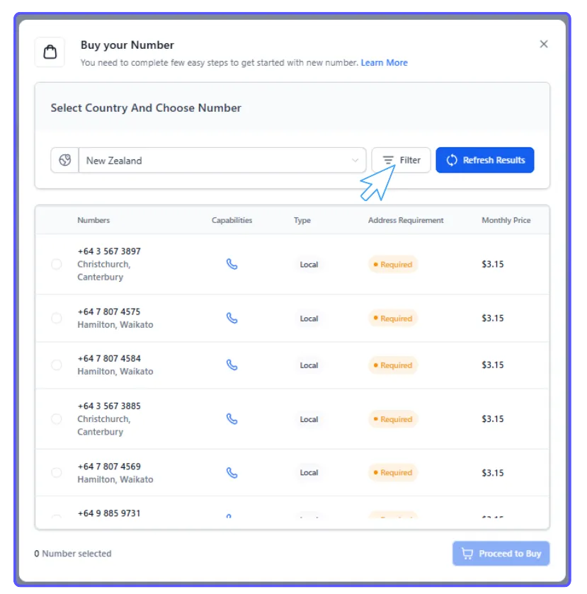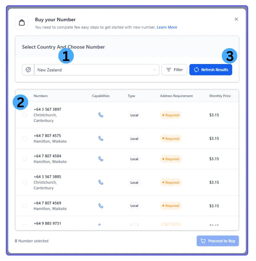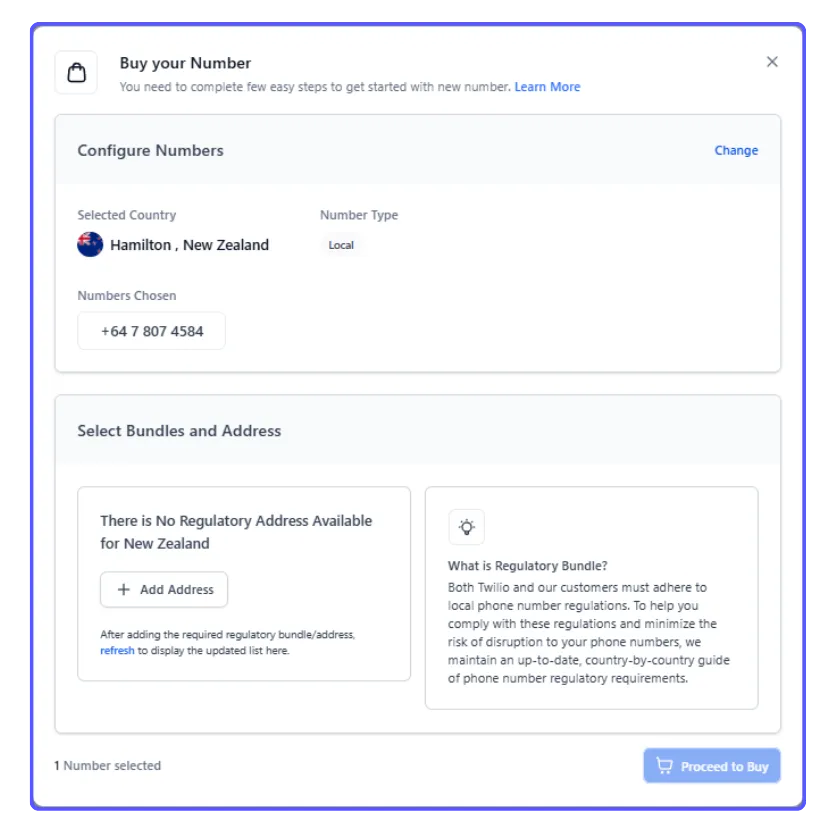For purchasing phone numbers in many countries, including New Zealand and Australia, you might need to provide specific regulatory information, often referred to as a "Bundle" or "Address." This ensures compliance with local telecommunication laws. For detailed steps on how to submit these requirements, please consult our guide on "Regulatory Bundle and Address Creation."