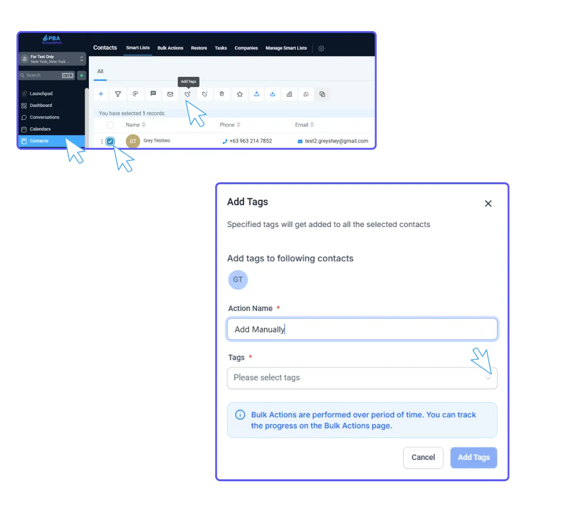 Confirm the tag appears in the contact’s tag list. Optionally add multiple tags the same way.
