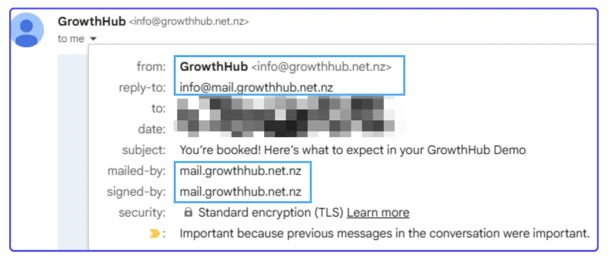 When you set up your own custom mail server domain, you will see a different "mailed- by", "sent on behalf", or "sent via" field.