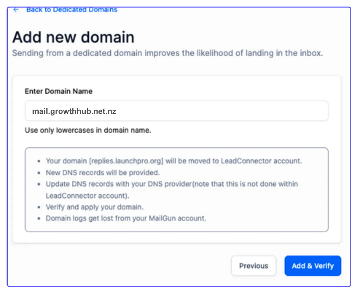 Add Your Subdomain: Click + Add Domain. Enter your chosen subdomain (e.g., mg.yourbrand.com) and click Add & Verify.