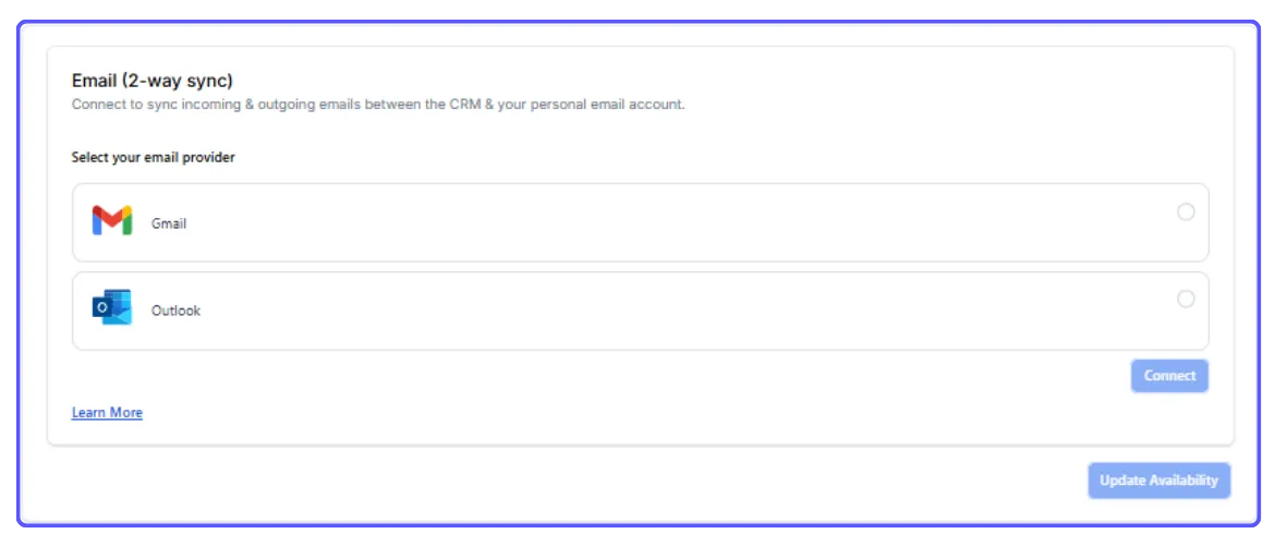 - You have the option to link your individual Gmail or Outlook email account, enabling the synchronization of both outgoing and incoming messages between GrowthHub and your chosen email service.