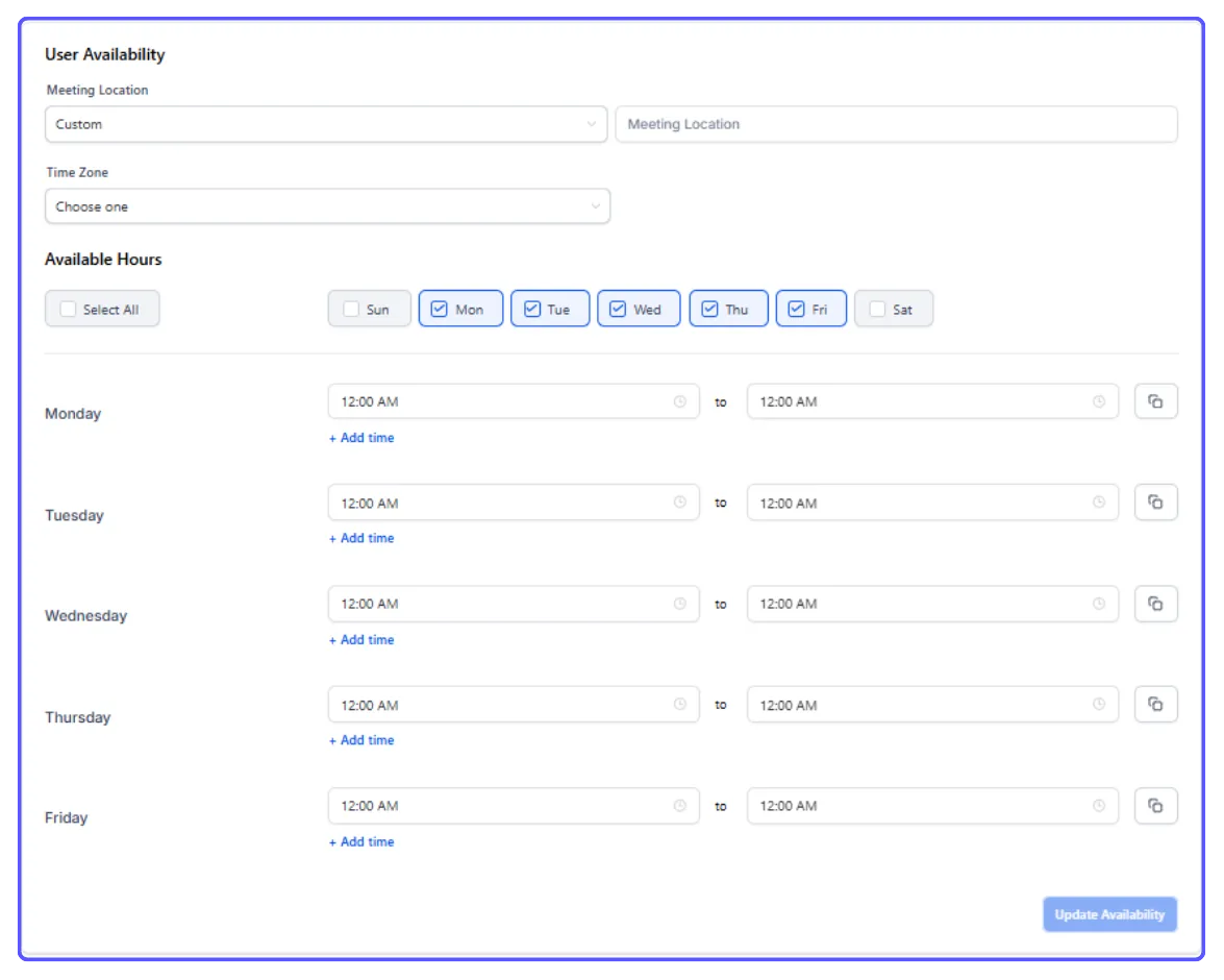 User Availability allows individuals to define their specific working hours and times when they can be booked for appointments. This ensures that clients can only schedule meetings when you are genuinely available, preventing conflicts and streamlining the booking process.